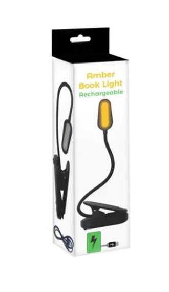 This unique book light emits zero blue light. This makes it easier to fall asleep after reading. It is rechargeable, has 4 LEDs and 3 levels of brightness. It will hold its charge for atleast 16 hours. It recharges with a USB cord, which is provided.