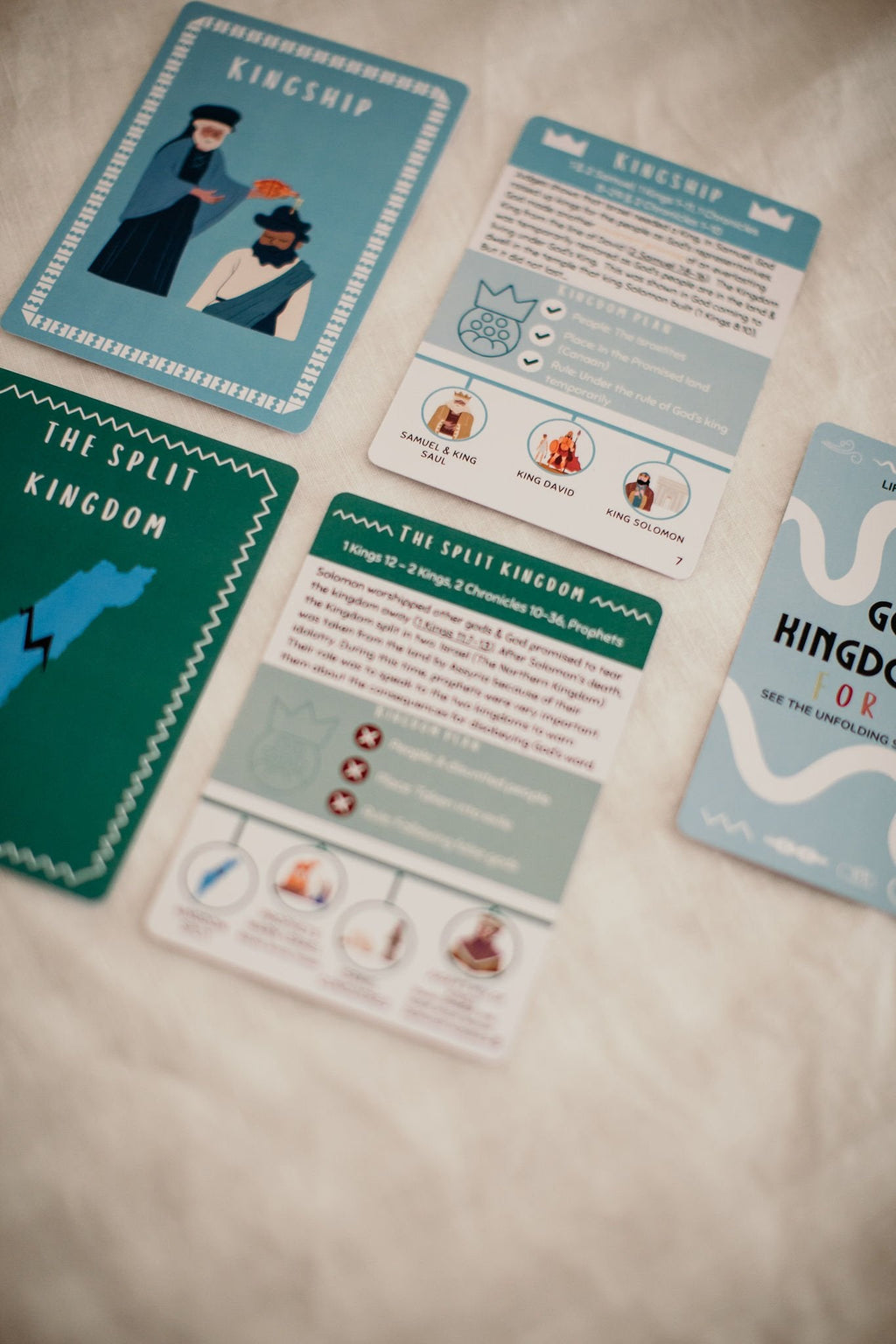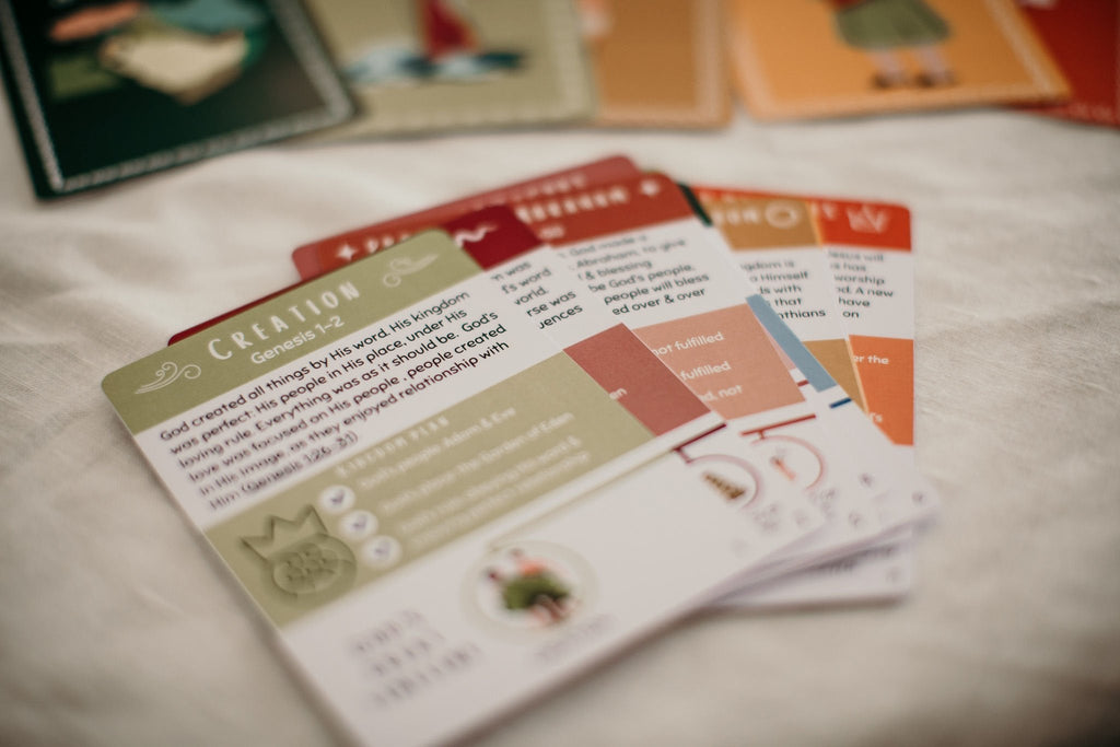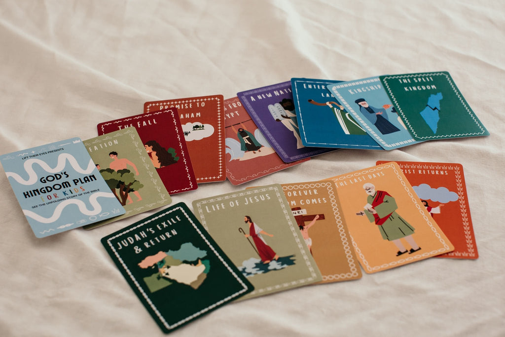 Help kids see God’s great kingdom plan run through history, with all God’s promises & plans being met in Jesus. This fun, easily memorised card set uses colour, symbols & pictures to give a hands-on, visual method to memorise the different phases of God’s kingdom plan. This resource helps kids place individual Bible stories in the bigger story of God’s great kingdom plan. Display it, memorise it, locate stories in it, sort it!
