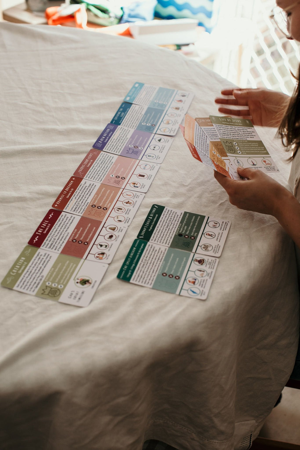 These large A6 cards are perfect for individual use or group settings like Sunday school or scripture. Made from thick cardstock with matte laminate for durability, with rounded corners. Custom-designed, washable drawstring bag included.