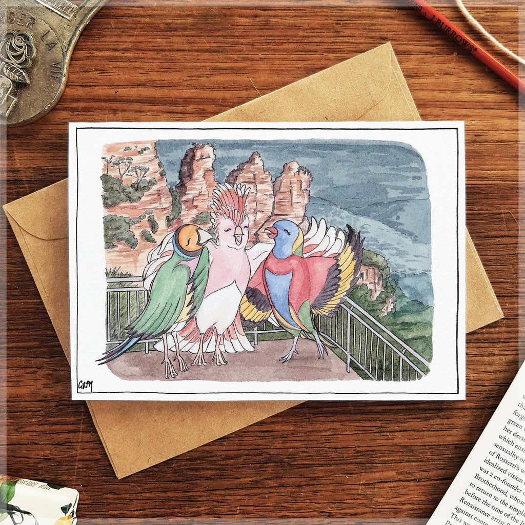 One of Australia's most loved Avian Girl Groups visiting one of Sydney's most beautiful Natural Beauties; the Blue Mountains. This also features as the Queen of Diamonds in my 'Battle of the Bands' playing card pack! You can find it in the Playing Cards Section :) The Original Ink and Watercolour Illustration was created by Avi Gray © This A6 greeting card has been professionally printed on 300gsm Felt paper. It Includes a brown paper envelope and is wrapped in a plastic sleeve. The card is folded and blank inside - 14.85cm x 10.5cm If you'd like to keep up-to-date with my artwork, please follow me on Instagram @erlenmeyer_art Thank you for supporting the World of Erlenmeyer!